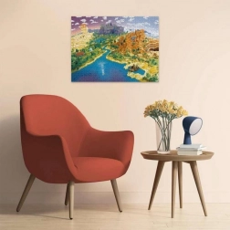 Grâce au papier antireflet à texture de toile de lin, l’image ne brille pas et l’assemblage reste agréable même sous une lampe. La technologie brevetée SoftClick garantit que chaque pièce s’emboîte uniquement à la bonne place – sans devoir pousser ni « forcer ».