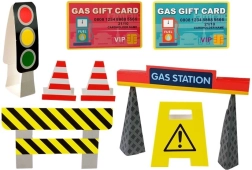 Un feu tricolore, des panneaux, des cônes, une barrière et des cartes pour la pompe donnent des règles de circulation et une atmosphère réaliste au jeu.