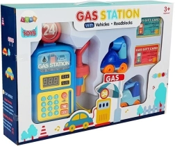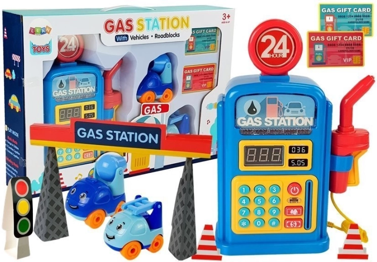 Amusante station-service pour enfants en bleu et jaune offrant un jeu de ravitaillement réaliste avec des petites voitures. Elle propose des effets lumineux et sonores, des instructions vocales en anglais, un lecteur de carte de paiement et un compteur de litres lorsqu’on appuie sur la poignée. Sont incluses 2 petites voitures souriantes (toupie à béton et camion de pompiers avec échelle), des panneaux de signalisation, des cônes et d’autres accessoires pour une jouabilité créative sans fin.