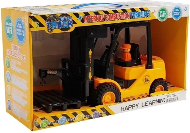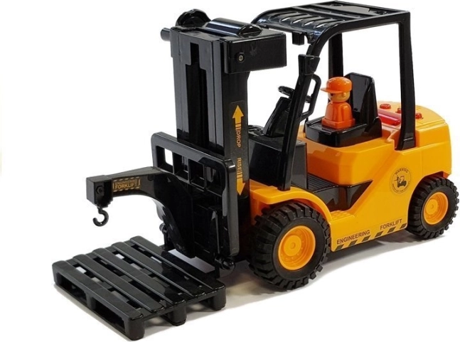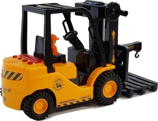 Ce chariot élévateur réaliste pour enfants, en couleur orange, propose des fourches mobiles, un crochet de chargement pratique et des effets lumineux et sonores interactifs. Grâce aux roues en caoutchouc, la conduite est fluide et stable, favorisant le développement de la motricité et le jeu créatif.