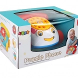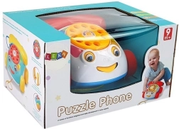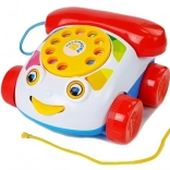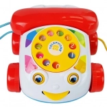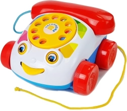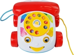 Le téléphone jouet possède un cadran à visser avec des chiffres, qui émet un bourdonnement et un tintement lorsqu’il se met en mouvement. De plus, il a des roues et, pendant le jeu et lorsqu’on le tire, les yeux et la langue du téléphone bougent. En jouant, l’enfant améliore la motricité de ses mains, en particulier ses compétences manuelles. Les différentes couleurs attirent le regard, ce qui aide l’enfant à apprendre à distinguer les couleurs. Un autre avantage est que, lorsque l’on appuie sur le bouton du combiné, on entend la voix d’un clown.