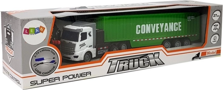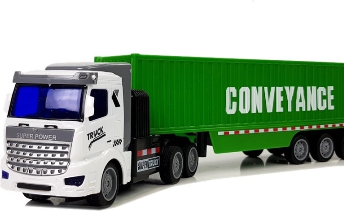 Ce camion télécommandé reproduit fidèlement un véhicule routier réel – cabine blanche, remorque verte et détails typiques qui attirent le regard. La commande facile à deux joysticks permet d’avancer/reculer et de tourner à droite/gauche, tandis qu’en marche avant la cabine s’illumine de LED bleues.