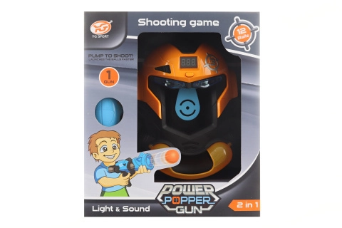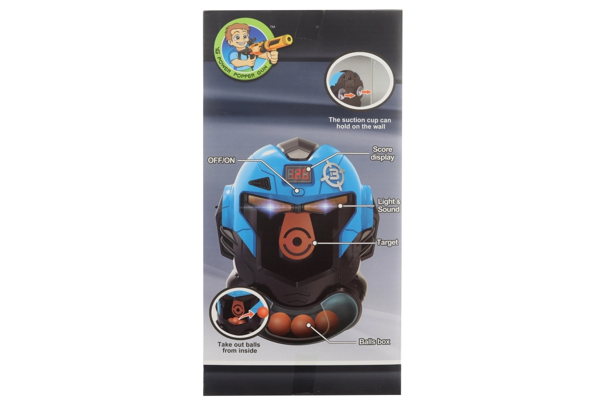 Ensemble sophistiqué comprenant un pistolet à balles en mousse et une cible en forme de masque. La cible dispose d’un compteur alimenté par piles (2x AA – non incluses). Après insertion des piles et lorsqu’un tir atteint la cible, le compteur ajoute des points et émet des sons. Matière : plastique. Emballé en boîte. Dimensions de l’emballage : environ 25 x 29 x 14 cm. Âge : 8+
