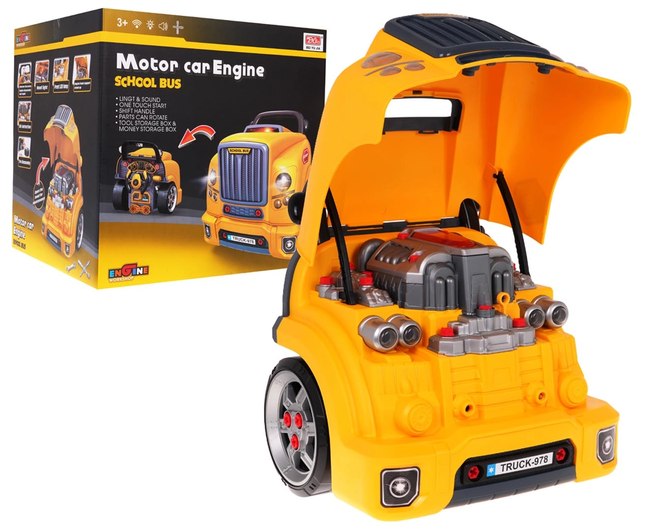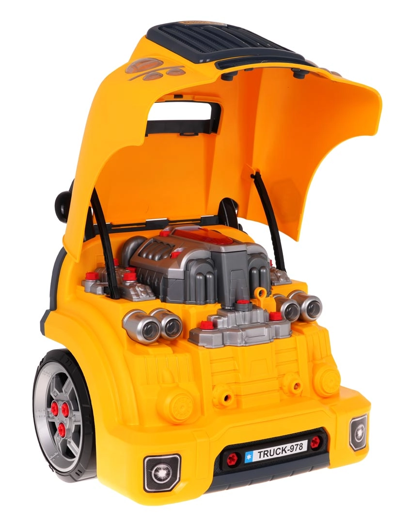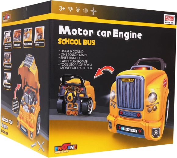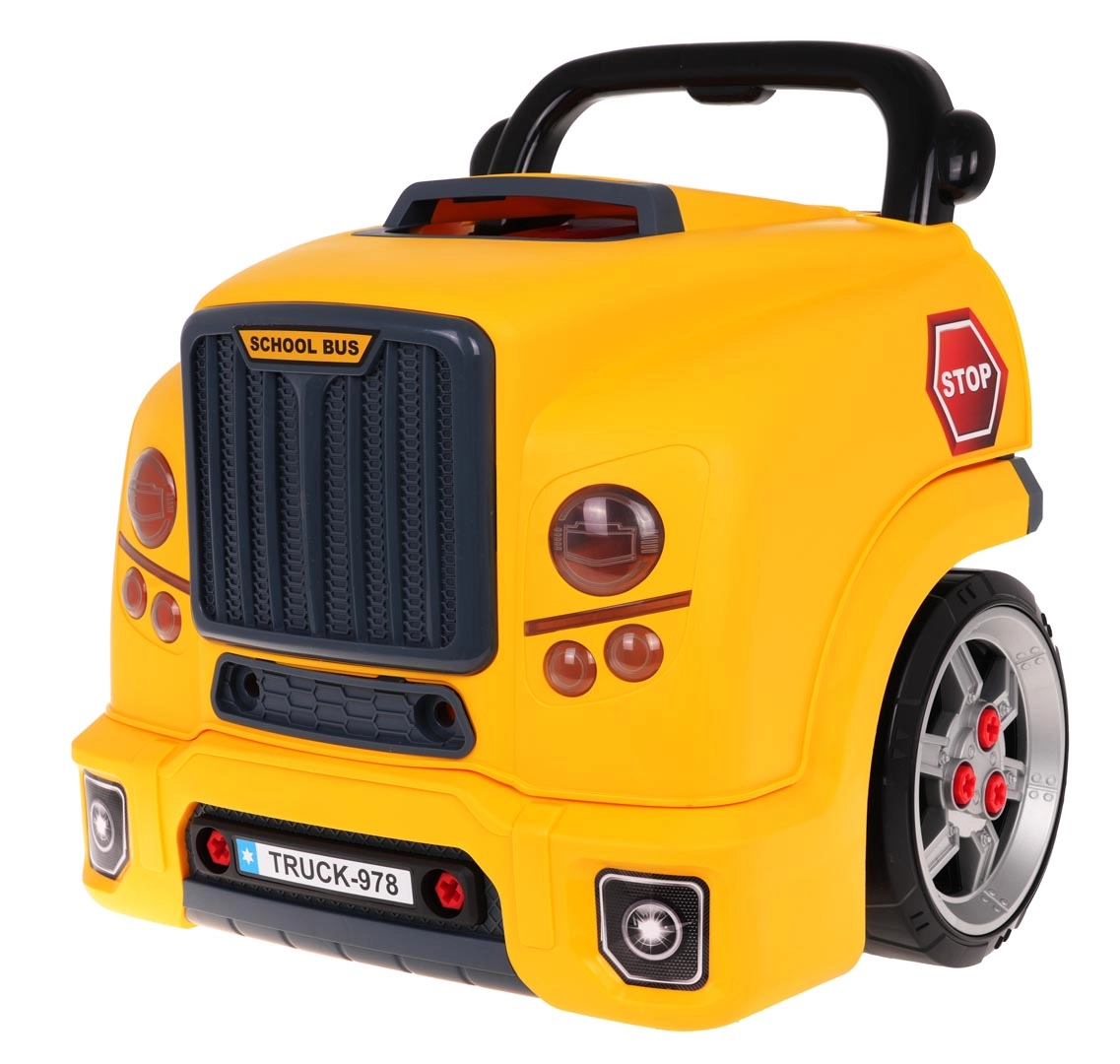 Jouet interactif, bus scolaire jaune avec capot avant relevable et tableau de bord, destiné aux enfants à partir de 3 ans. L’ensemble comprend des éléments pour assembler la partie avant du bus et des outils nécessaires au montage et au démontage des pièces, comme un tournevis et des clés. Sous le capot se trouve un grand moteur amovible que l’enfant peut démonter. Les bougies d’allumage et les roues peuvent également être remplacées. Sur le tableau de bord se trouvent un bouton de démarrage du véhicule avec sons d’allumage du moteur, un volant avec klaxon et un avertisseur d’urgence. Sous le volant se trouve un compartiment de rangement pour tous les outils, vis et boutons nécessaires. Le jouet dispose d’une poignée de transport confortable. Alimentation par 3 piles AA 1,5 V (non incluses). Ce jouet pour petits mécaniciens automobiles développe la dextérité manuelle, la motricité fine et la coordination œil-main. . Fonctions : . - capot du bus relevable, . - moteur rotatif, . - sons d’allumage du moteur, de conduite, de marche arrière, .- klaxon sur le volant, .- sirène d’urgence, .- phares lumineux, .- éclairage du moteur, .- compartiment à outils, .- levier de vitesses, .- poignée de transport confortable, .- guidon mobile, . |