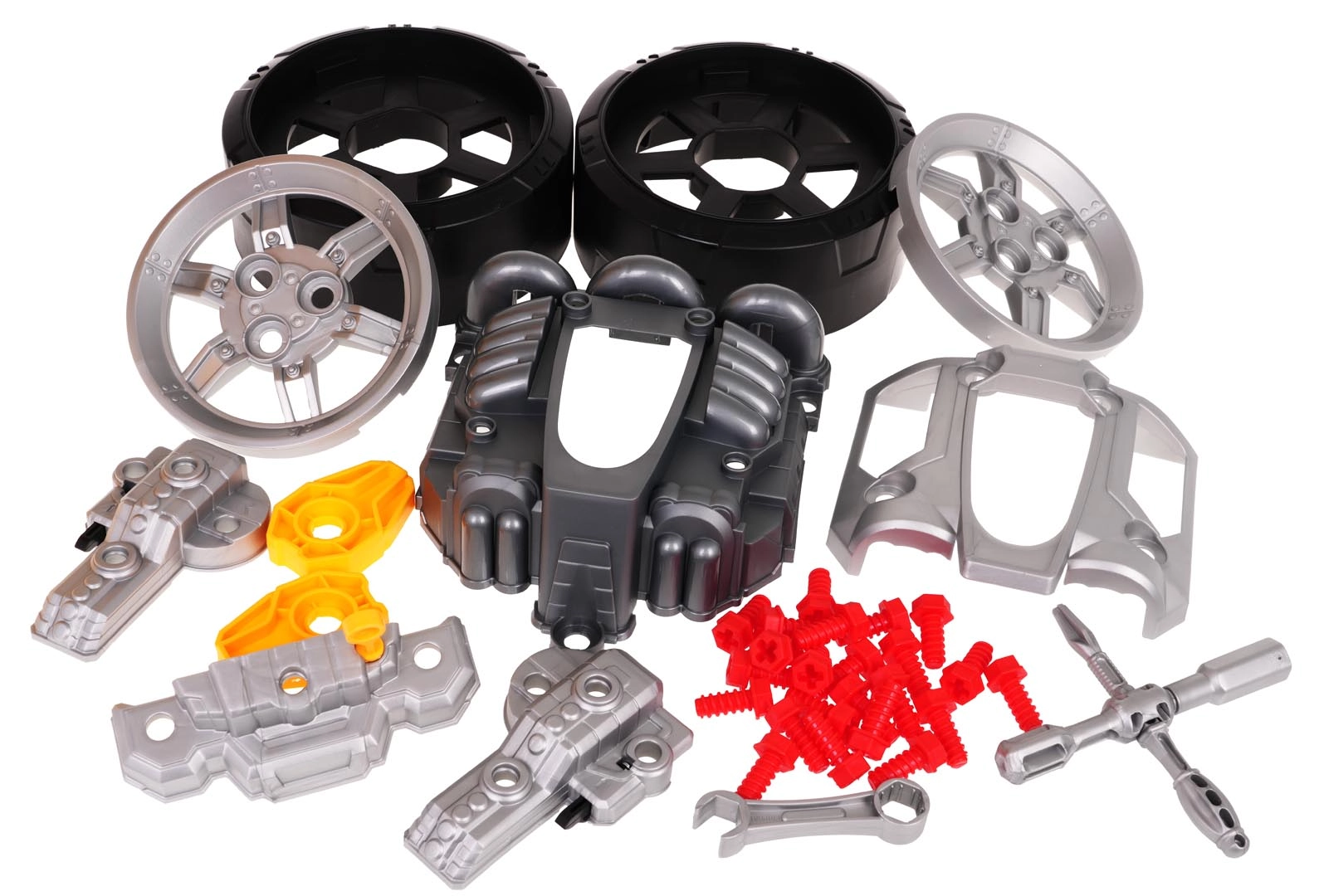- partie avant du véhicule avec moteur détachable, .- roues avec enjoliveurs, .- vis, .- outils, .- autocollants décoratifs, .- notice. . |