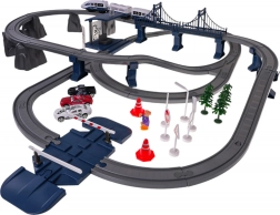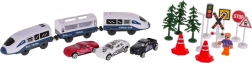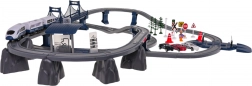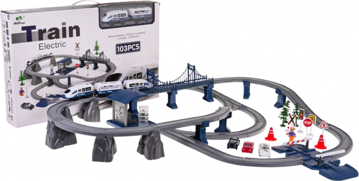 - Rails, gare, pont, train, 4× panneau de signalisation, feu tricolore, lampe, 3× sapin, 2× cône, 2× barrière, 3× petite voiture, figurine