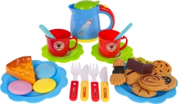 Assiettes, couverts, tasses, théière, cupcakes, biscuits et roulé – tout pour servir et jouer avec les amis.