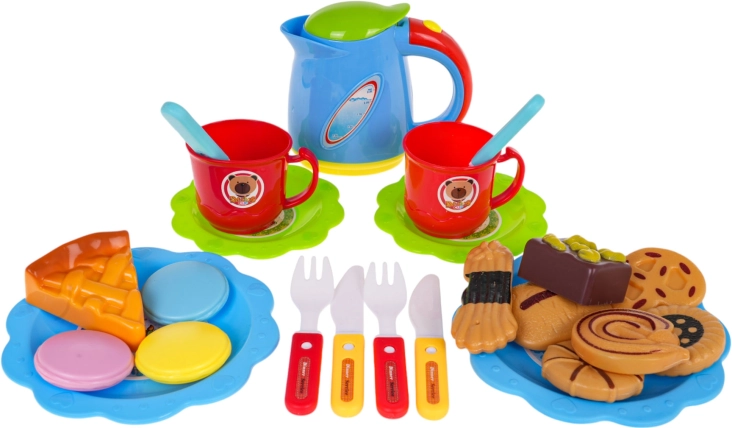 - Couteaux 2 petits (env. 11 × 2 cm) et 1 grand (env. 14 × 2,5 cm), cuillères 2 pcs (env. 10 × 2,5 cm), fourchettes 2 pcs (env. 10 × 2,5 cm), tasses 2 pcs (env. 5 × 7 cm), assiettes 4 pcs (petites Ø env. 10 cm, grandes Ø env. 13,5 cm), théière (env. 10 × 11 × 4 cm), sifflet, autocollants décoratifs