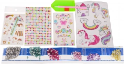 Un kit d’accessoires complet incluant un outil pour strass, un plateau, un carré adhésif et une lanière. Le cadeau parfait pour les petits fans de licornes.