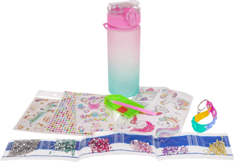 - gourde, lanière, stylet pour strass, plateau en plastique, carré adhésif, 6 sachets de strass, planche licornes, planche de strass (408 pièces), planche composition florale, planche de pochoirs, autocollant avec inscription