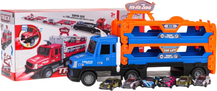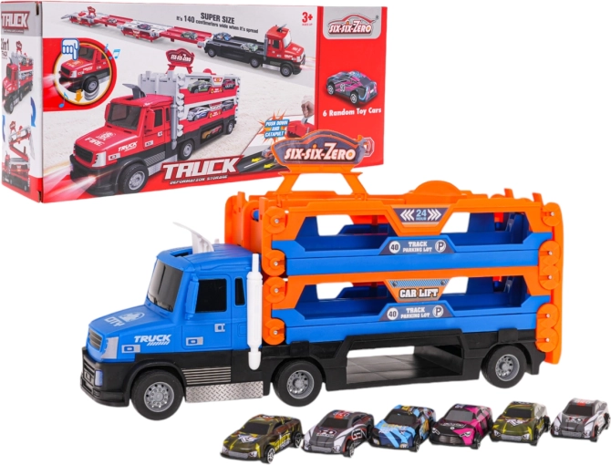 Camion interactif à trois niveaux avec catapulte pour enfants dès 3 ans, combinant rangement et course en un seul jouet. Une fois déplié, il se transforme en un long circuit de course jusqu’à 140 cm et, grâce aux pneus en caoutchouc, il reste stable pendant la conduite. Inclus: 6 petites voitures en métal (1:64), des effets lumineux et sonores et un lanceur pour un jeu dynamique.
