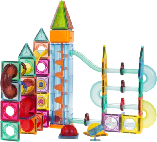 Des tubes transparents, des formes magnétiques et des éléments uniques permettent aux enfants de concevoir des parcours originaux qui stimulent l’imagination et la pensée logique.