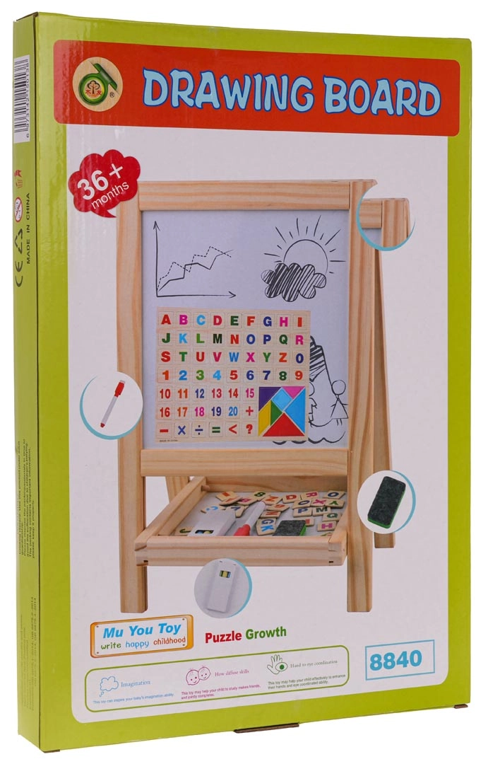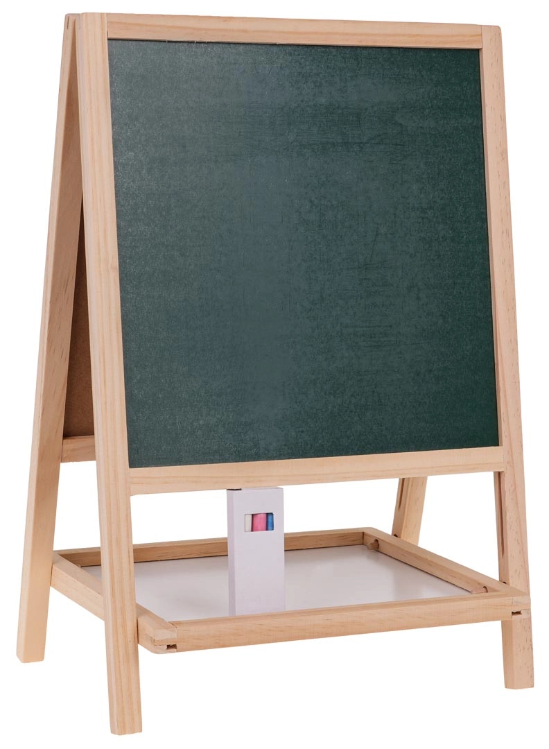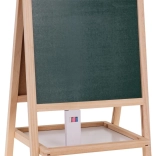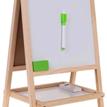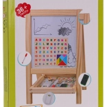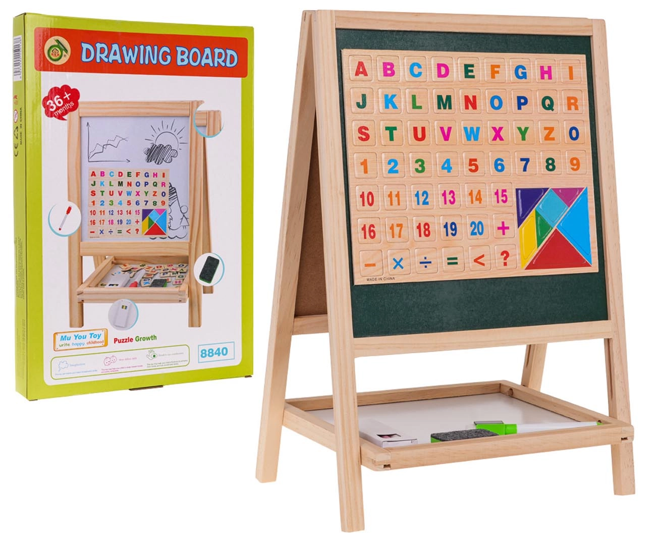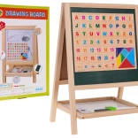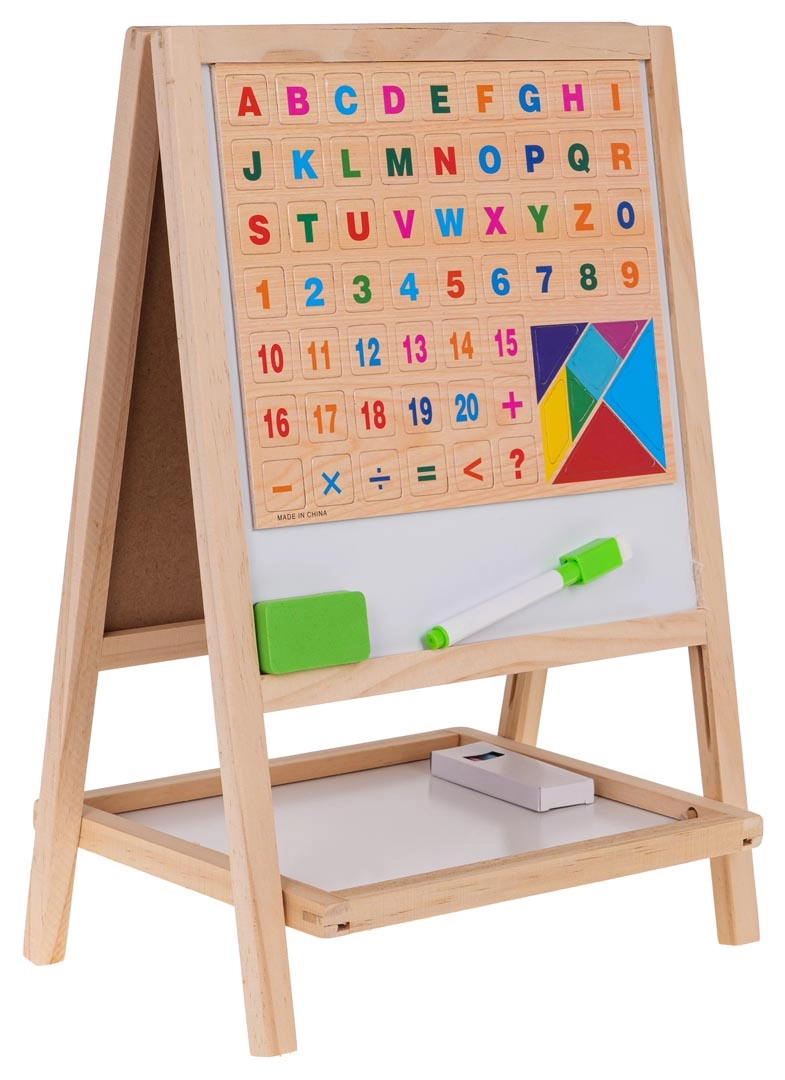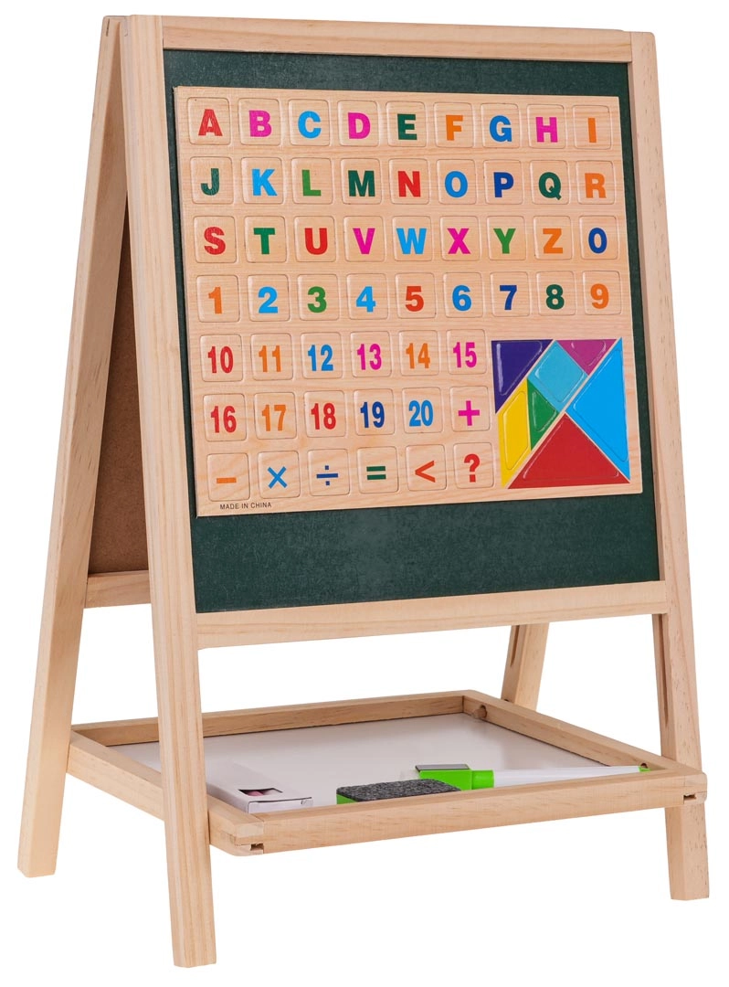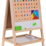 Tableau double face en bois pour enfants à partir de 3 ans. Un côté est blanc pour dessiner au feutre, l’autre est noir pour dessiner à la craie. Le tableau est magnétique des deux côtés et inclut des lettres, des chiffres et des formes géométriques magnétiques.