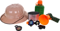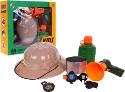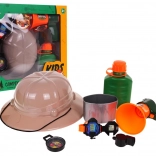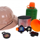 Coffret du Petit Explorateur idéal pour les enfants dès 3 ans. Comprend un chapeau, une gourde, un mégaphone, une montre, une boussole et un sifflet pour stimuler l’imagination des enfants.