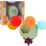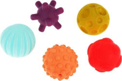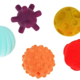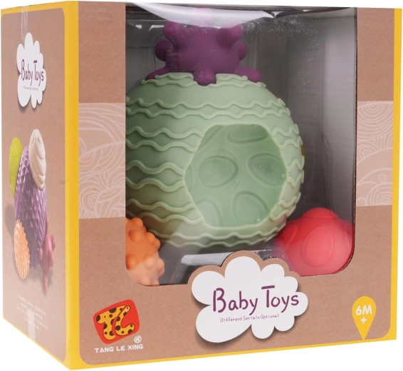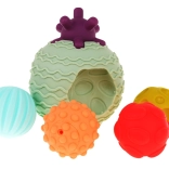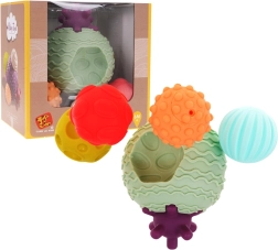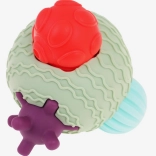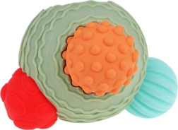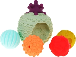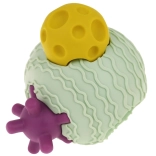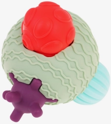 Cette balle sensorielle est un compagnon idéal pour le bain des tout-petits. Le set comprend une grande balle et quatre petites balles aux textures et formes variées. La balle principale possède des cavités dans lesquelles s’insèrent les petites balles, aidant l’enfant à distinguer différentes couleurs et formes.