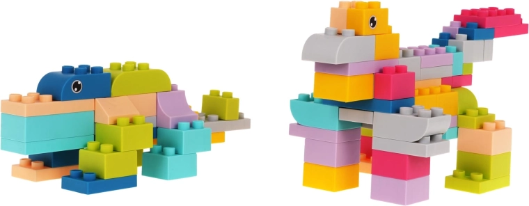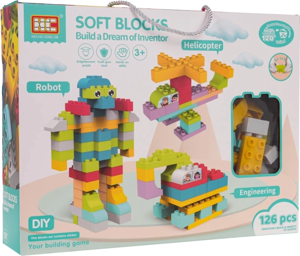 L’ensemble comprend 126 blocs souples en PVC sûr, sans bords tranchants et faciles à manipuler. Les blocs sont conçus dans des couleurs vives qui enchantent et stimulent l’imagination des enfants. Ils sont très faciles à entretenir : après ébullition, ils conservent leur couleur et peuvent être pliés puis retrouvent leur forme d’origine.
