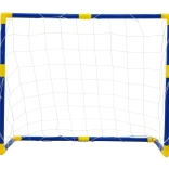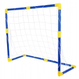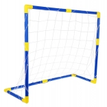 Les tubes bleus avec raccords jaunes s’emboîtent facilement pour former un cadre stable. Le filet est solidement fixé autour de la structure, ce qui permet d’installer et de déplacer le but en un rien de temps.