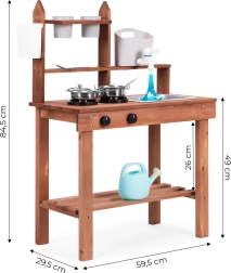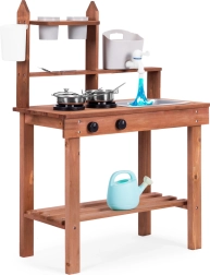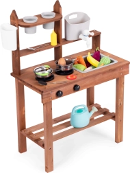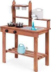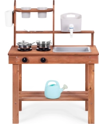 Elle encourage les jeux de rôle et permet aux enfants de « cuisiner » avec du sable, de la terre ou des cailloux. Des étagères et crochets pratiques gardent la vaisselle à portée de main, tandis que ses dimensions compactes facilitent l’installation même dans les petits espaces.
