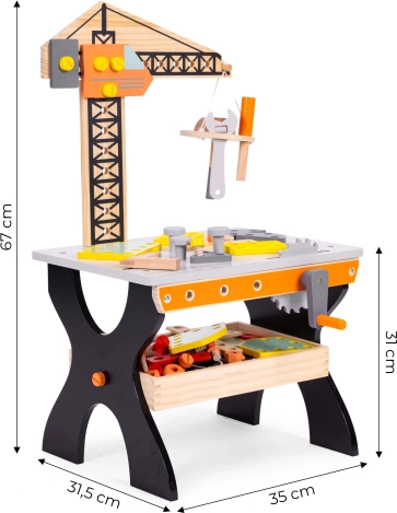 L’établi avec grue, outils et connecteurs stimule l’imagination, la motricité fine et enseigne les bases du bricolage en toute sécurité.