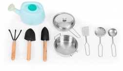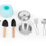 Des détails astucieux comme le robinet fonctionnel, les portes ouvrantes du placard ou du « four », et les roues à bande de roulement en caoutchouc pour un déplacement en douceur font de cette cuisine un poste de jeu apprécié. Le riche ensemble d’accessoires (casserole, poêle, louche, passoire, spatule, arrosoir et outils de jardin) stimule l’imagination et favorise le jeu autonome.