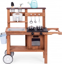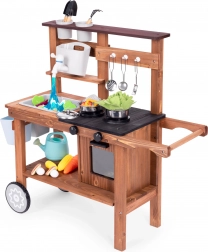 Cette cuisine pour enfants robuste allie le plaisir du jeu de rôle à la découverte de la nature. Grâce au bois de sapin résistant, elle est idéale à l’intérieur comme à l’extérieur. Les enfants peuvent « cuisiner » avec du sable, de la boue et des cailloux, remplir l’évier d’eau et « régler la température » à l’aide des boutons rotatifs.