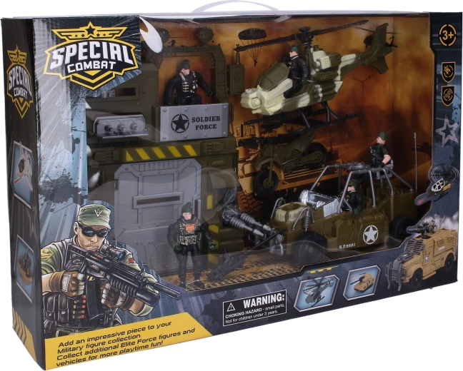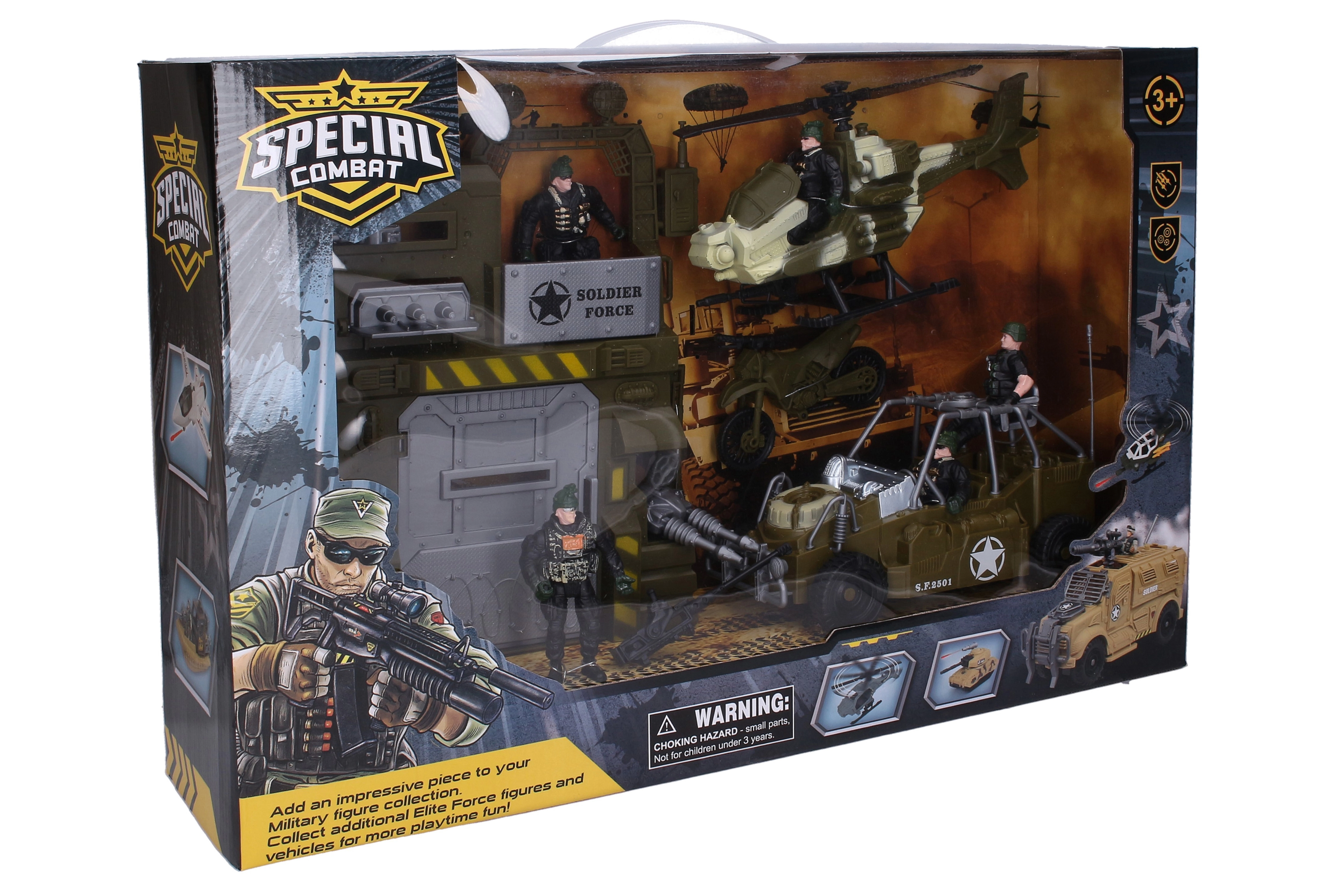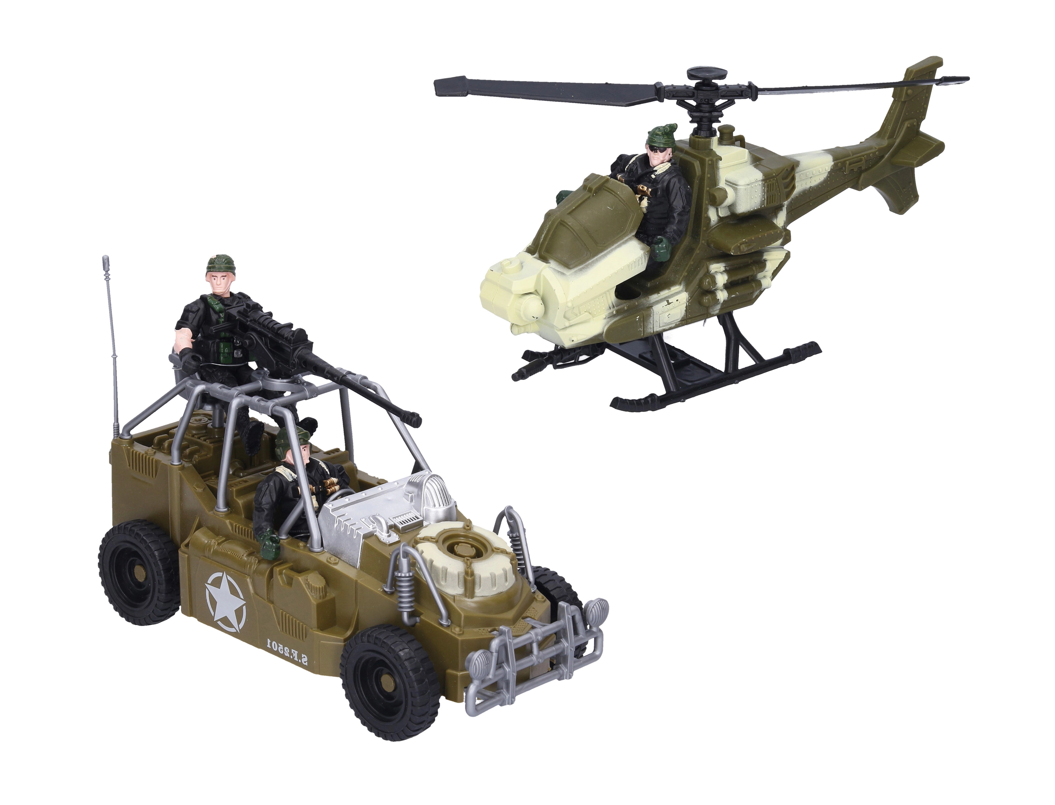 - Voiture, hélicoptère, moto, 5 figurines de soldats, armes et accessoires