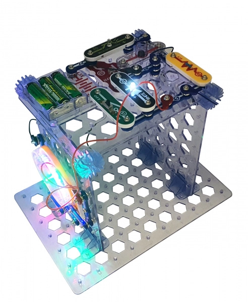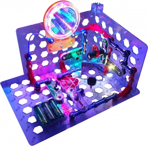 Toutes les pièces se fixent simplement sur une grille transparente. Le montage est rapide, clair et idéal pour les premiers pas en électronique.