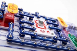 Les pièces se fixent sur la plaque de base grâce à des contacts à encliqueter. Le code couleur et les libellés des composants facilitent l’orientation, même pour les enfants dès 8 ans.