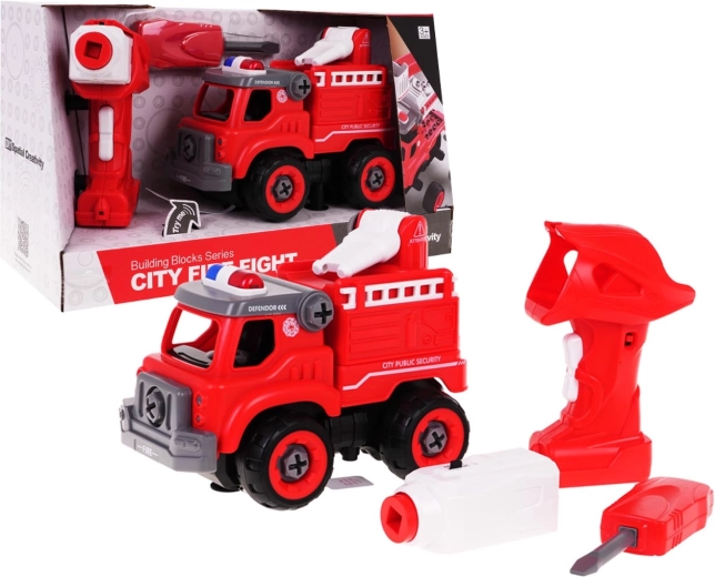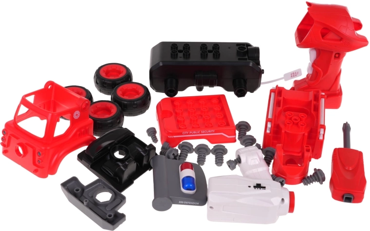 - Camion de pompiers, perceuse/télécommande, tournevis, panneau de contrôle, notice