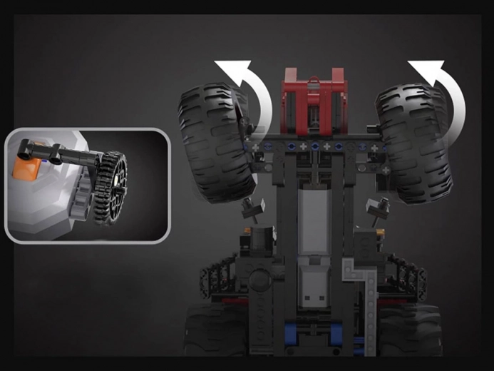 Deux moteurs M, un moteur L et un servomécanisme précis assurent la marche avant/arrière et une direction précise. Relevez l’attelage arrière et faites pivoter le support de 180° à distance.