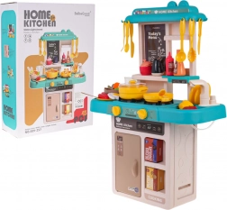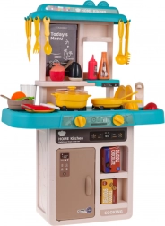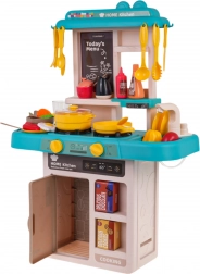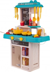 Cette cuisine pour enfants dans des tons tendance bleu et turquoise transforme la chambre en petit bistrot. La plaque de cuisson interactive émet des sons de cuisson et de friture lorsque l’on tourne les boutons et éclaire les brûleurs. De l’eau coule réellement du robinet, permettant aux enfants de rincer la vaisselle comme dans une vraie cuisine.