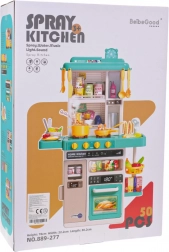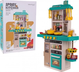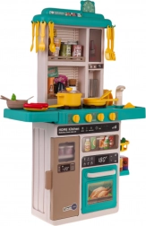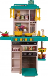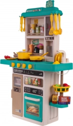 Cette cuisine pour enfants offre un jeu de cuisine réaliste grâce aux brûleurs rétroéclairés, aux boutons rotatifs et aux sons de friture et de cuisson. L’un des brûleurs émet une fine vapeur d’eau pour renforcer l’immersion. Le robinet avec eau courante permet aux petits chefs de rincer la vaisselle comme dans une vraie cuisine.