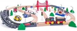 Un set complet avec rails, pont, panneaux de signalisation, arbres et véhicules qui stimule la créativité et la construction de tracés variés.