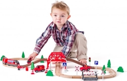 Set complet avec train, rails, pont, panneaux de signalisation, arbres et figurines offrant d’innombrables possibilités de jeu et scénarios du monde des pompiers.
