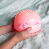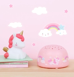 Endormez-vous sous un ciel étoilé magique. Lampe projecteur sans fil rose au motif licornes qui projette des étoiles sur les murs et le plafond, dotée d’un pratique minuteur de 30 minutes et qui, grâce à la technologie LED, ne chauffe pas. Parfaite comme veilleuse pour la chambre d’enfant et facile à transporter.