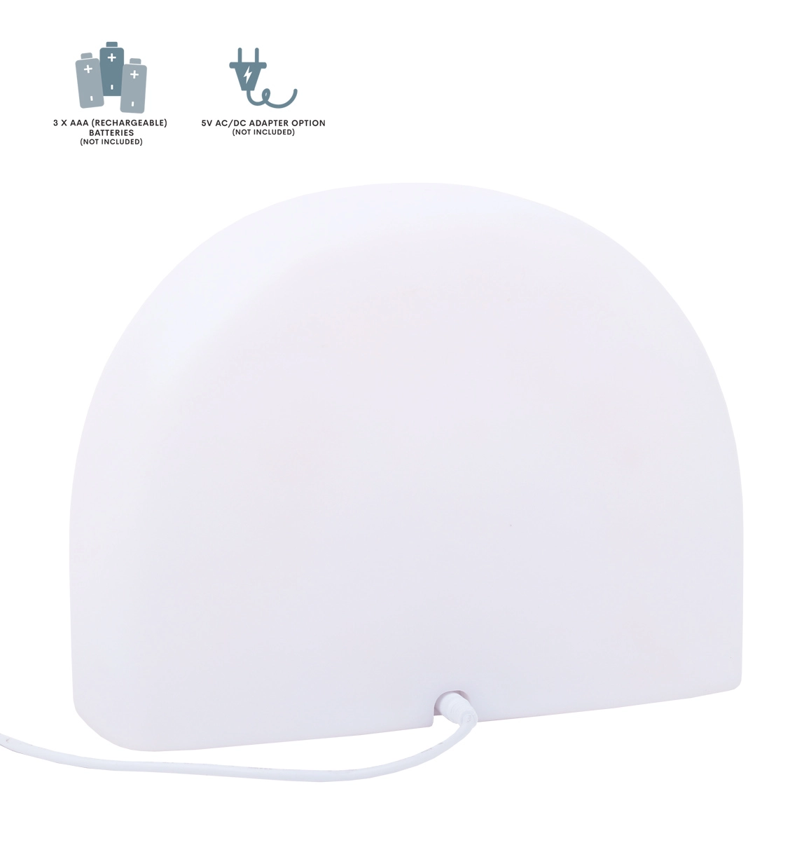 Le format sans fil permet un transport facile, à la maison comme en voyage. Un témoin lumineux au bas de la lampe indique l’activation du minuteur. Pour la sécurité, veillez à bien fermer le compartiment à piles à l’aide de la vis fournie.