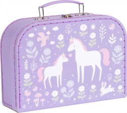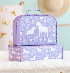 L’ensemble de deux valisettes décoratives d’A Little Lovely Company propose un design ludique avec licornes, arc-en-ciel et fleurs sur fond violet. Léger mais robuste, le carton durable avec des surpiqûres de qualité assure une longue durée de vie et un transport confortable.