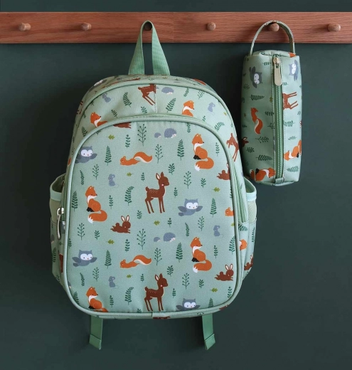 Spacieux sac à dos vert menthe avec motif d’animaux de la forêt, idéal pour la maternelle et les excursions. Il offre une grande compartimentation principale, une poche avant isotherme pour le goûter, des poches latérales pour bouteille et des bretelles rembourrées avec sangle de poitrine pour un port confortable et sûr.