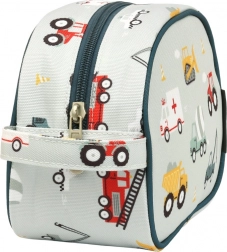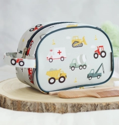 Un imprimé coloré de voitures, pelleteuses et camions sur un fond neutre ravira chaque enfant et facilitera l’identification de sa propre trousse.