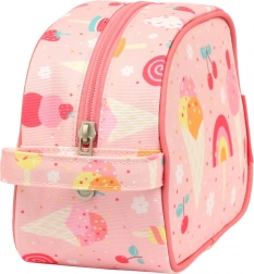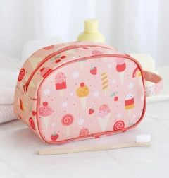 Adorable trousse de toilette rose à motif glace, idéale pour les voyages, les colonies et l’usage quotidien. Elle offre une grande poche principale, une anse pratique pour un transport facile et un matériau léger et facile à nettoyer.