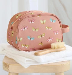 Spacieuse trousse de toilette rose avec motif de papillons, idéale pour les sorties, les camps et les vacances. Elle offre une grande poche principale pour les articles d’hygiène, une poignée pratique pour un transport facile et une conception résistante pour un usage quotidien.