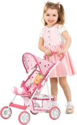 La capote s’ajuste selon le soleil ou la pluie pendant le jeu, et le panier inférieur accueille les accessoires de la poupée ainsi que les jouets préférés.