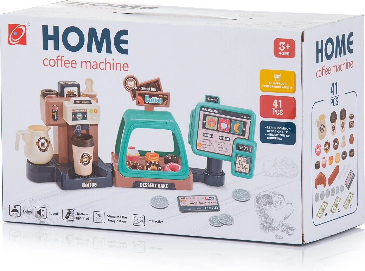 Le coffret comprend 41 pièces d’accessoires différentes, dont une machine à café, des tasses, un tamper, des pièces, des billets, une caisse enregistreuse et un présentoir à pâtisseries.