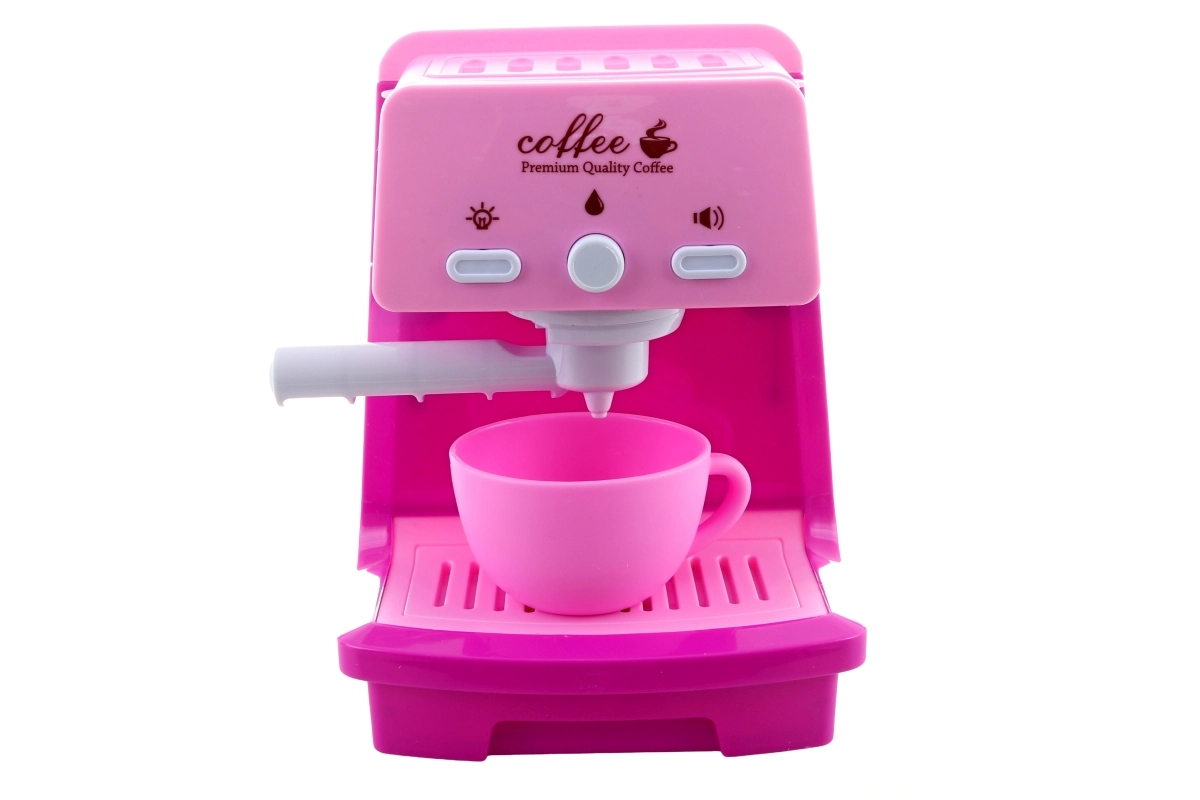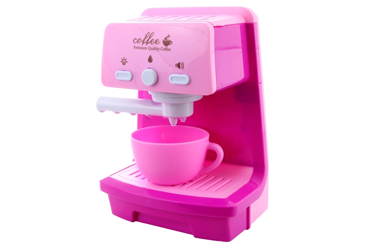 Cafetière pour enfants avec effets lumineux et sonores, porte-filtre et petite tasse. Le réservoir peut être rempli d’eau et pompé manuellement — comme pour la vraie préparation d’un espresso.