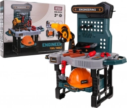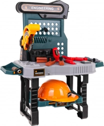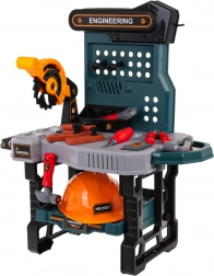 Atelier pour enfants richement équipé avec casque, scie circulaire et accessoires pour enfants à partir de trois ans. Comprend 37 pièces réalistes pour un jeu créatif et le développement des compétences motrices.