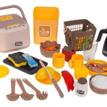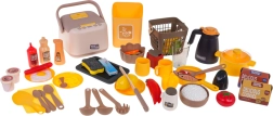 - Cuisine, panneau musical, tableau avec éponge et craies, cuiseur à riz avec bol, panier, bouilloire, poêle, casserole avec couvercle, épices et sauces, vaisselle et couverts, aliments et autocollants décoratifs