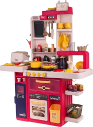 Un panneau musical avec mélodies et sons de hotte, une ardoise à craie pour messages et recettes, ainsi qu’un cuiseur à riz avec vapeur sont inclus. Une conception colorée de qualité en plastique durable et des détails bien pensés comme des boutons rotatifs et une horloge à aiguilles font de cette cuisine un cadeau idéal.