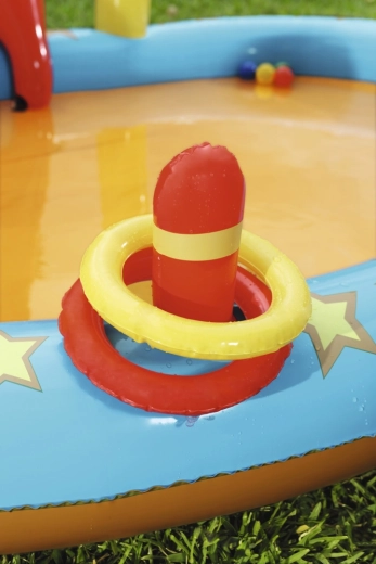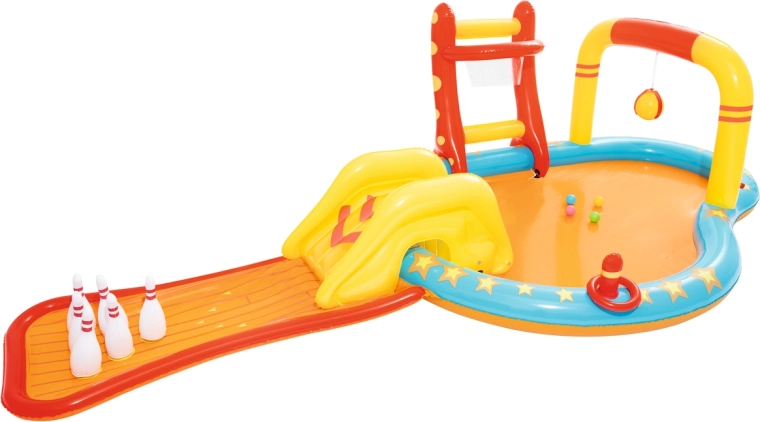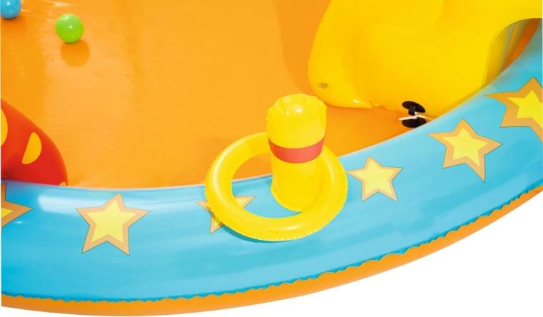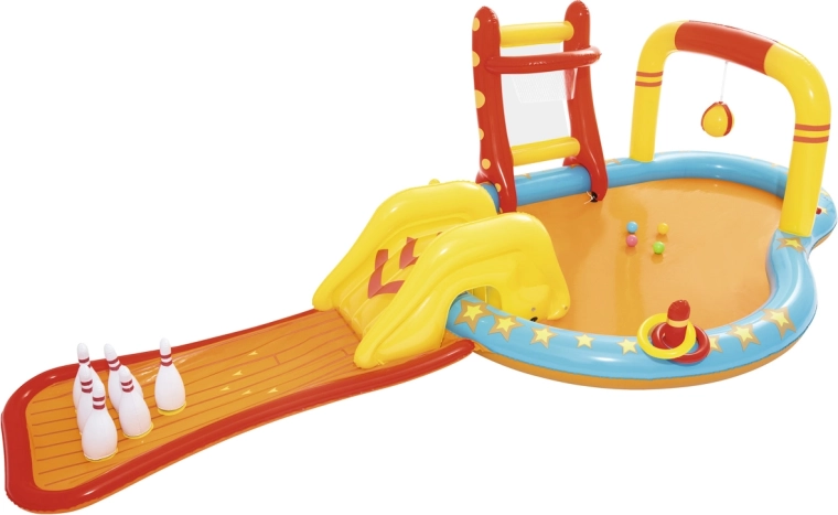 Un équipement riche comprenant des quilles, des anneaux gonflables, des balles et un panier favorise diverses activités et développe coordination et motricité. Les parents apprécieront la vidange facile grâce à la valve de vidange et l’entretien simple. Parfait pour les après-midis entre amis comme pour les moments de joie en famille.