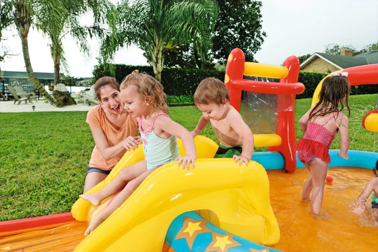 - Petite piscine peu profonde sécurisée – fond gonflable pour un atterrissage en douceur.