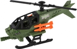 L’hélicoptère militaire vert avec rotors noirs et missiles orange se distingue par un look réaliste, idéal pour stimuler des scénarios de jeu palpitants.